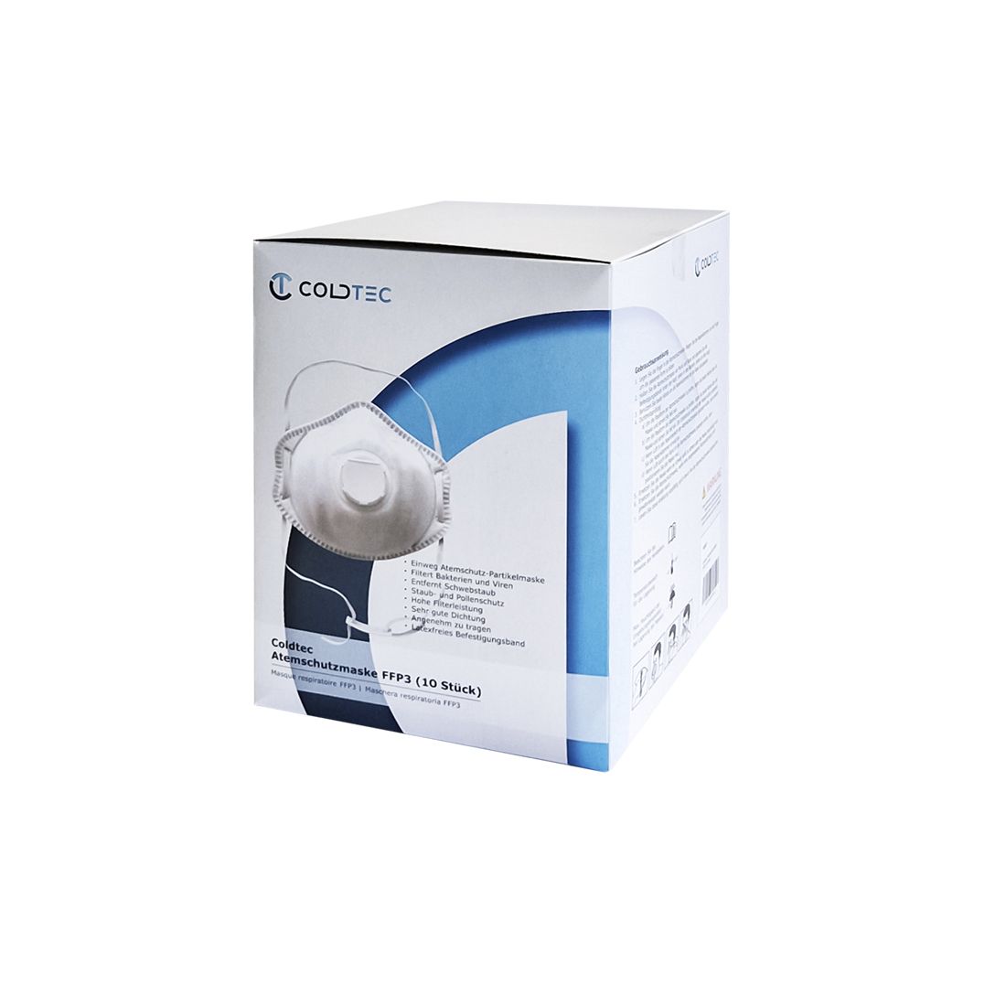 Die FFP3 Atemschutzmasken der Firma Coldtec sind CE-verifiziert und für den einmaligen Gebrauch geeignet.