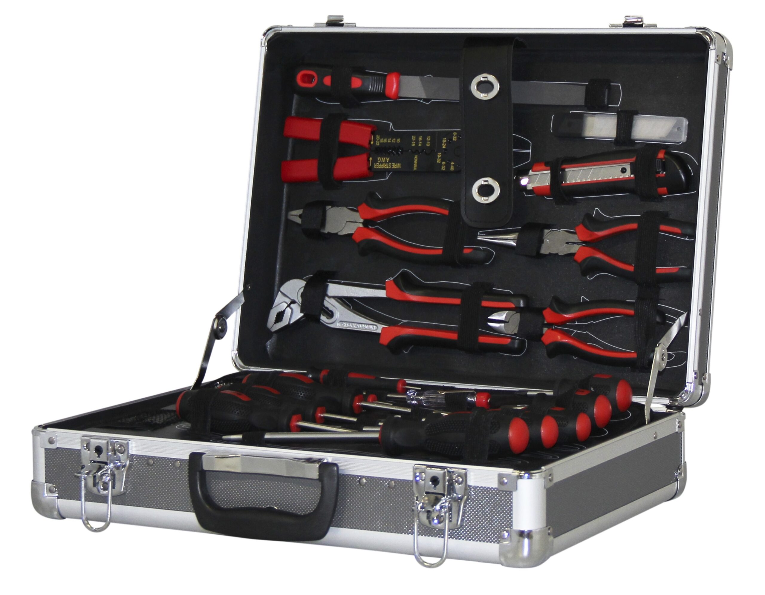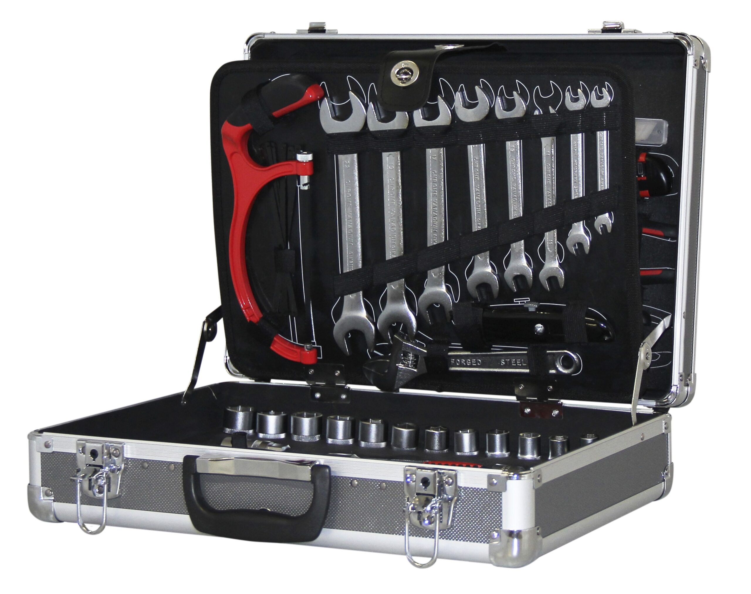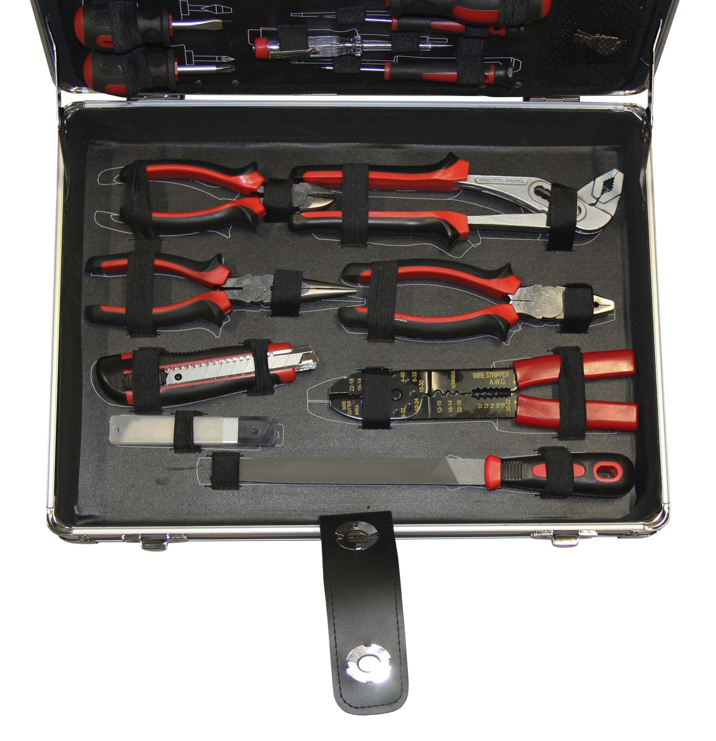 Der Werkzeugkoffer beinhaltet eine grosse Auswahl von handlichen Werkzeugen, eingebettet in einem Aluminiumkoffer.