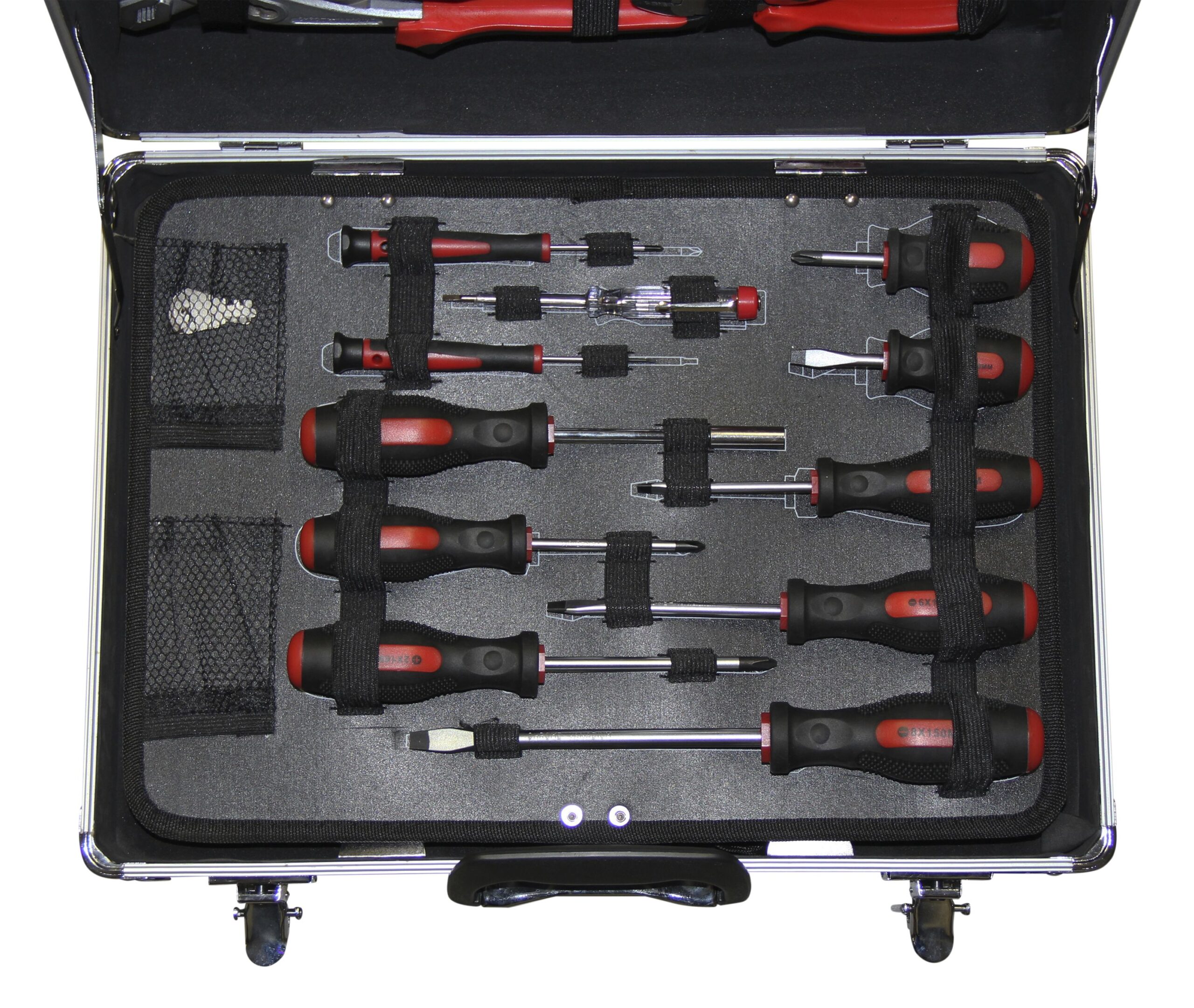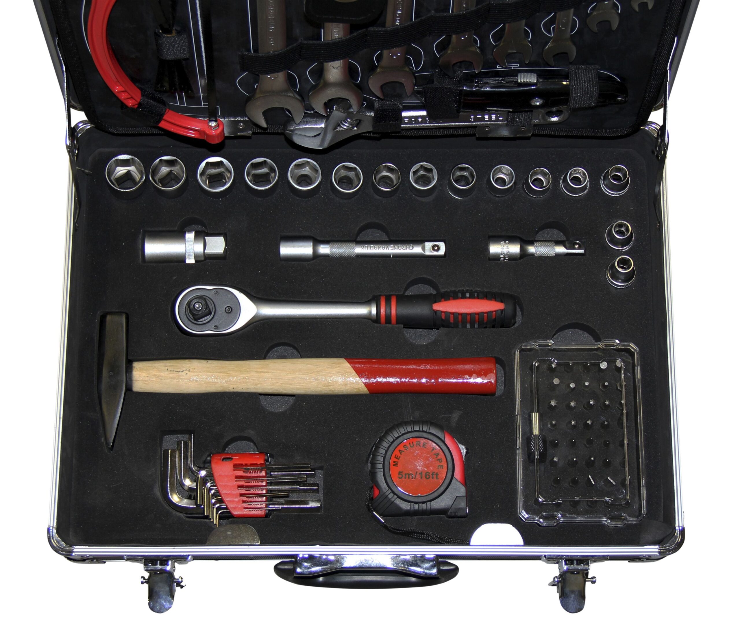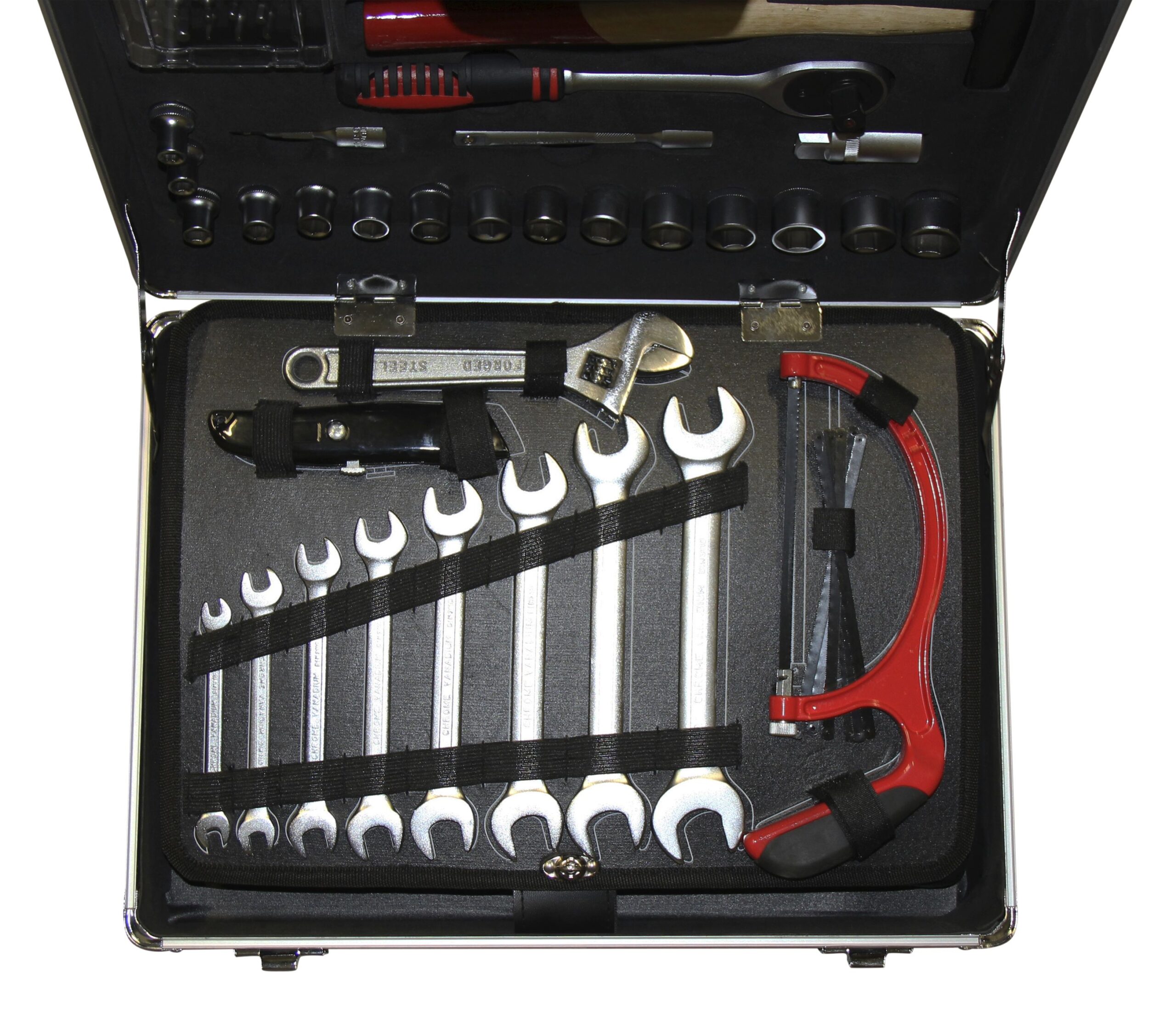Der Werkzeugkoffer beinhaltet eine grosse Auswahl von handlichen Werkzeugen, eingebettet in einem Aluminiumkoffer.